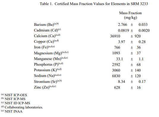 表 1 和表 2 提供了 SRM 3233 中元素和維生素的認(rèn)證質(zhì)量分?jǐn)?shù)值,以干質(zhì)量為基礎(chǔ)報(bào)告。NIST 認(rèn)證值是 NIST 對其準(zhǔn)確性有最高置信度的值因?yàn)樗幸阎蚩梢傻钠妬碓炊家驯徽{(diào)查或考慮 [1]。價(jià)值分配分析由 NIST 和合作實(shí)驗(yàn)室進(jìn)行。認(rèn)證值計(jì)算為 NIST 方法的平均值、美國農(nóng)業(yè)部 (USDA) 方法的平均值以及合作實(shí)驗(yàn)室提供的平均結(jié)果的中位數(shù)(如果適用)。所有值在沒有加權(quán)的情況下合并。相關(guān)的不確定性以 95% 的置信水平表示 [2-4]。