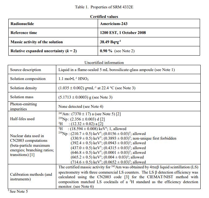 在 2008 年 10 月 1 日美國東部標(biāo)準(zhǔn)時間 1200 的參考時間,經(jīng)認(rèn)證的 Americium-243 質(zhì)量活度值為:(38.49 ± 0.35) Bq?g-1